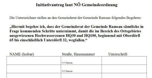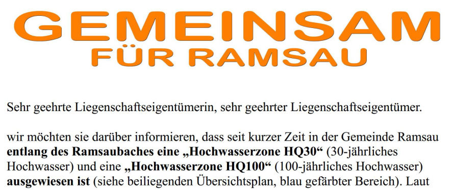 Wir haben das Thema in die Hand genommen und zum ersten mal in der Geschichte Ramsaus einen Initiativantrag gestartet. Durch Unterschriften der Bevölkerung konnte das Thema von Bgm. Gertraud Steinacher nicht mehr ignoriert werden. Widerwillig wurde uns zugestimmt, das Ergebnis der Hochwasserpläne überarbeiten zu lassen.